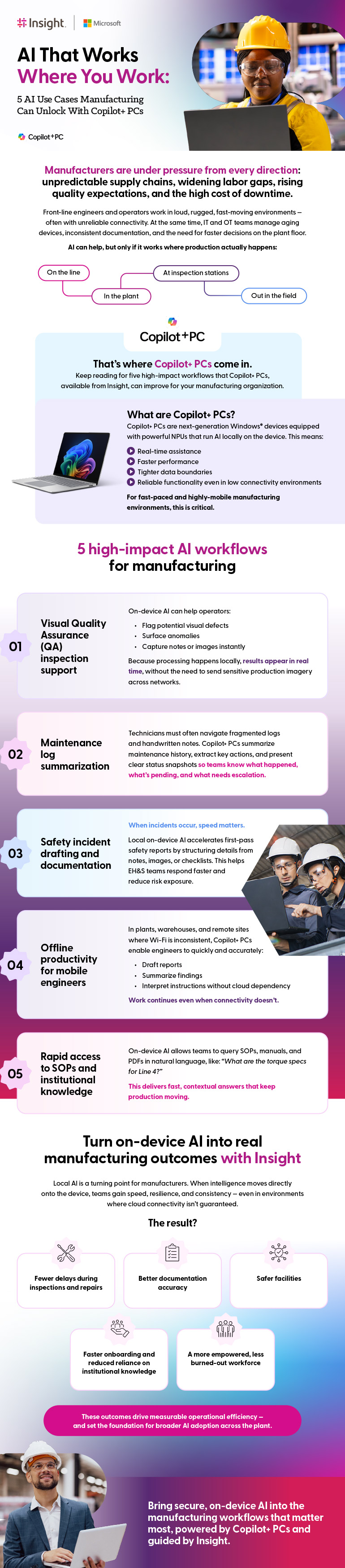 Keep reading for five high-impact workflows that Copilot+ PCs, available from Insight, can improve for your manufacturing organization.