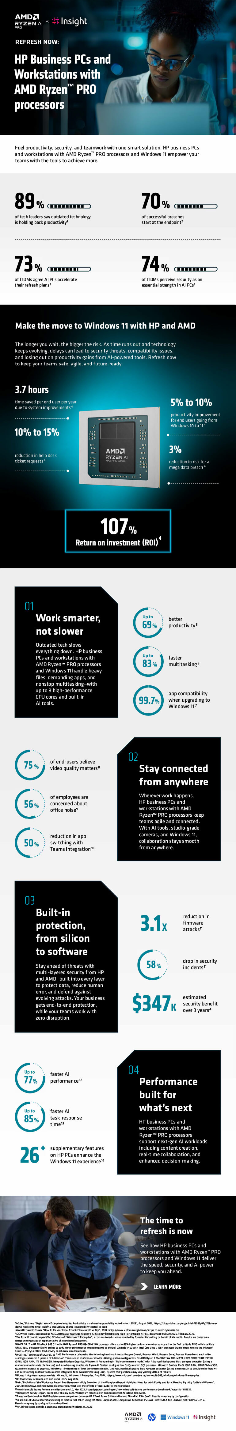 See how HP business PCs and workstations with AMD Ryzen PRO processors and Windows 11 deliver the speed, security, and AI power to keep you ahead.